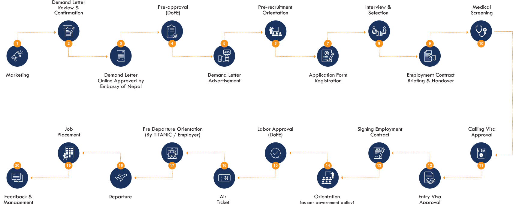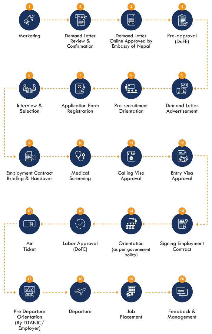 To secure the foreign employment opportunities at zero cost available in Titanic Manpower Supplier Pvt. Ltd., applicant or their family members or anyone else are prohibited to pay any cash amount, do any deposit or bond or other valuable items like gold, jewellery, mobile, watch and livestock including any kind of gift neither to Titanic Manpower Supplier Pvt. Ltd. and it’s employee nor any other person/organization.